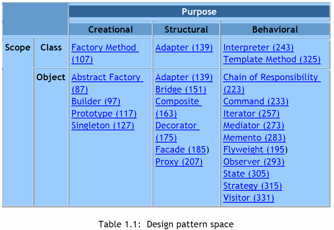 GoF에서는 23가지의 디자인 패턴이 있으며, 첫번째, 패턴이 하는 일에 대해 목적(Purpose)으로 구분하고, 두 번째로 compile-time이냐 run-time이냐에 따른 적용 범위(Scope)으로 구분한다.