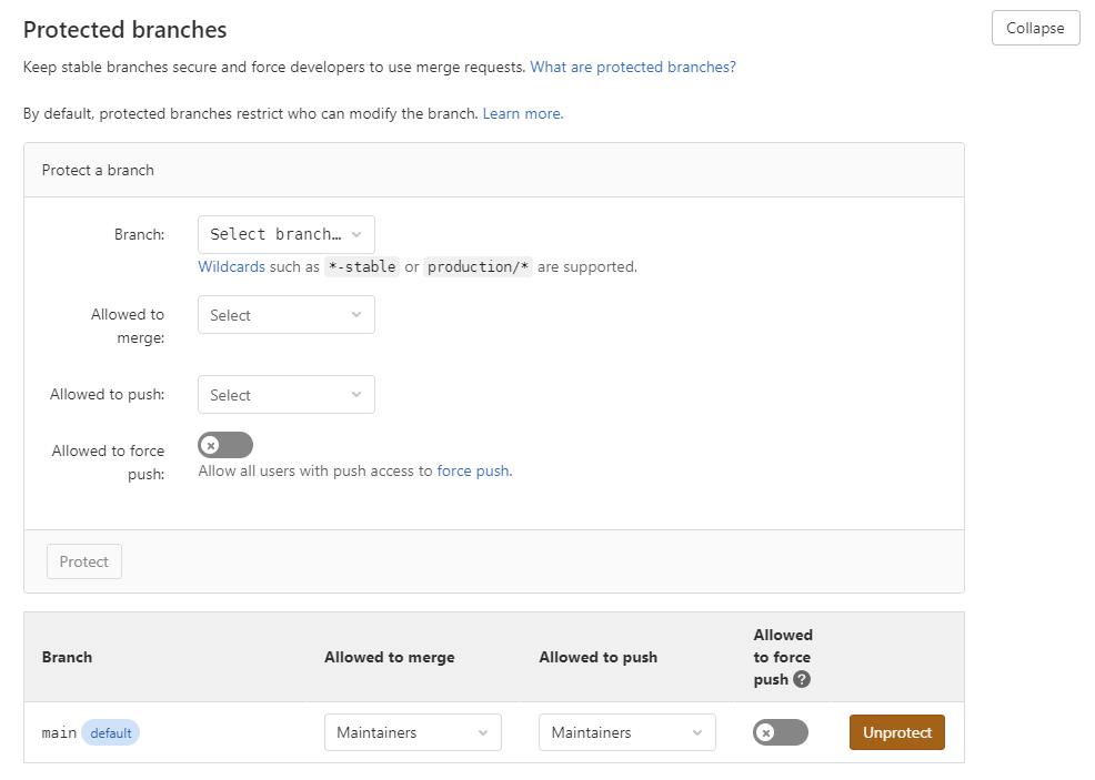 3. Protected branches 항목에서 [Expand] 클릭 - 해당 브랜치에서 [Unprotect] 클릭
